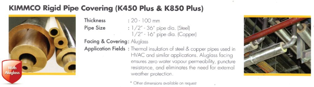 - Faced with FSK – Pipe sections, with a factory-applied reinforced Aluminum foil covering (FSK) incorporating an overlap (self-adhesive in some cases). This helps to provide effective vapor control.