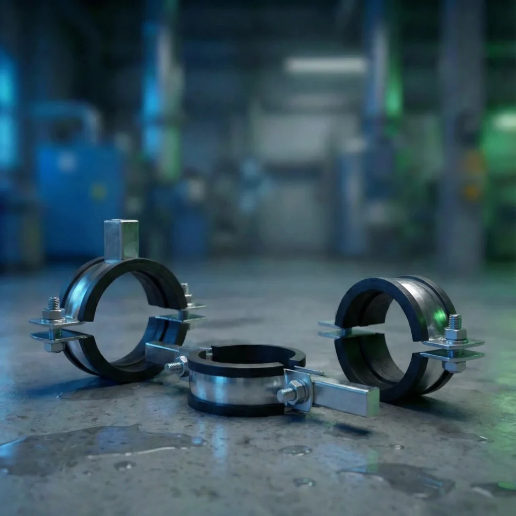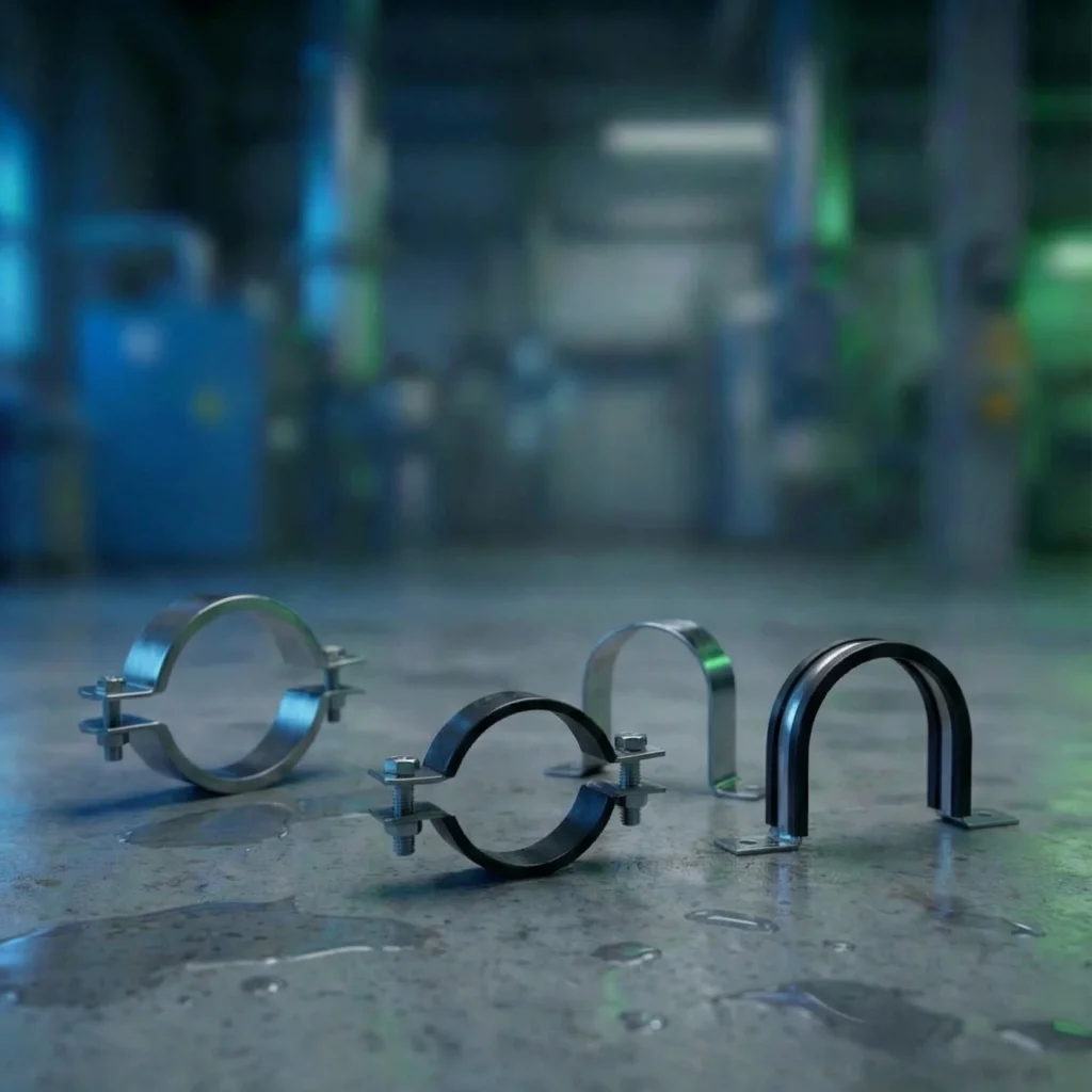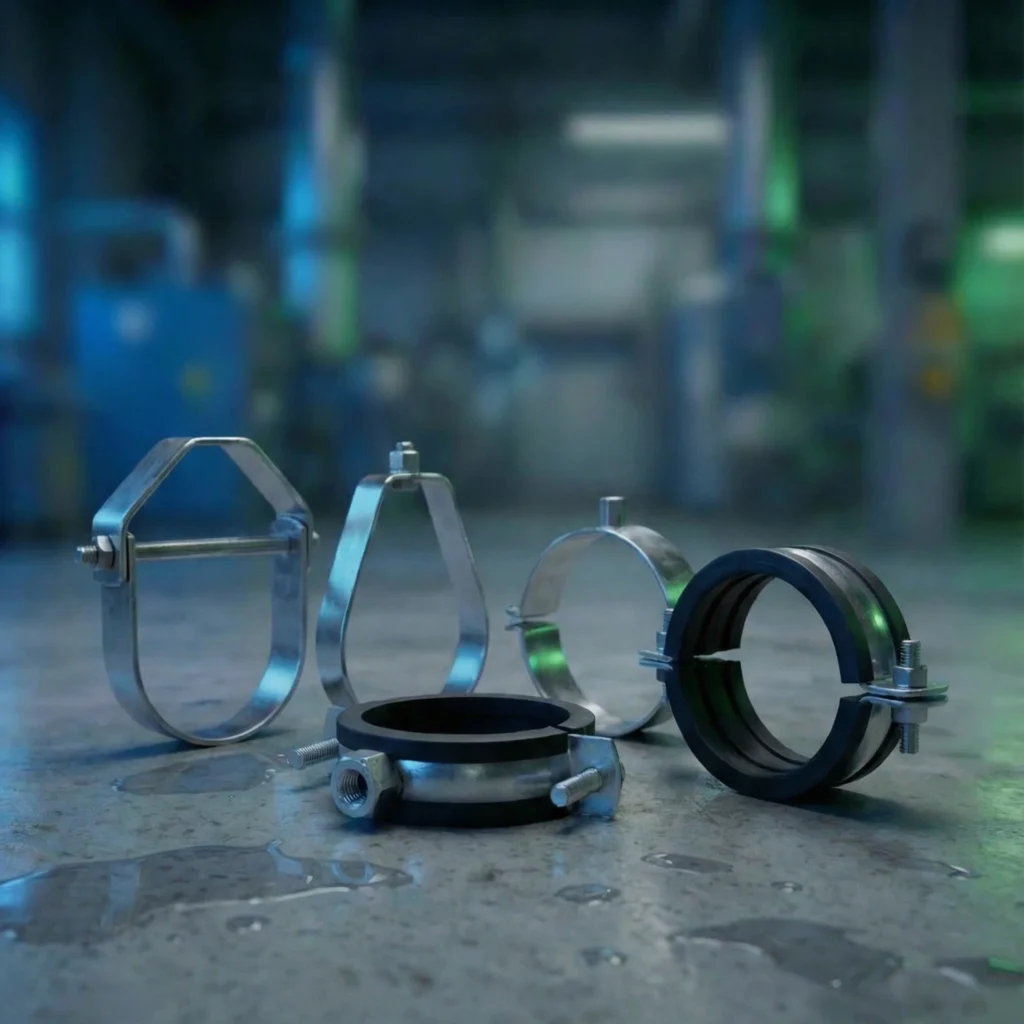 Clives hanger – Swivel hanger – Pipeclamp – U.Bolt – Ustrap – Rubber insert – Threaded Rod – Nuts – Washer